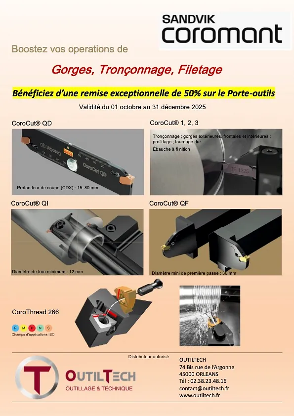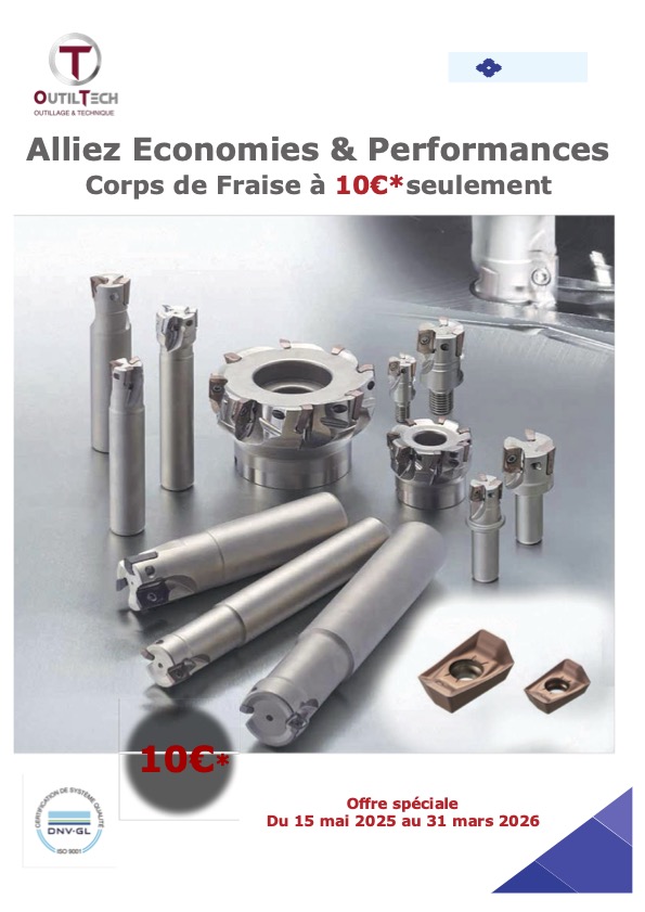 Découvrez les dernières promotions proposées par OUTILTECH. Votre spécialiste de l'usinage à Saint-Jean-De-Braye vous fait bénéficier régulièrement de remises exceptionnelles sur ses produits, spécialement sélectionnés auprès des meilleurs fabricants dans le monde entier. Équipez-vous dès aujourd’hui au meilleur prix avec des outils de coupe performants et atteignez tous vos objectifs de production :
